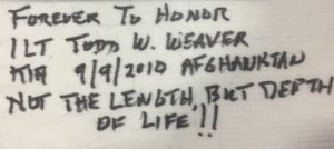 While leading a dismounted patrol in Kandahar, Afghanistan, 1st Lt. Todd Weaver and his unit was attacked by insurgents and was struck by an improvised explosive device. Todd passed away because of the wounds he suffered from that attack by insurgents.